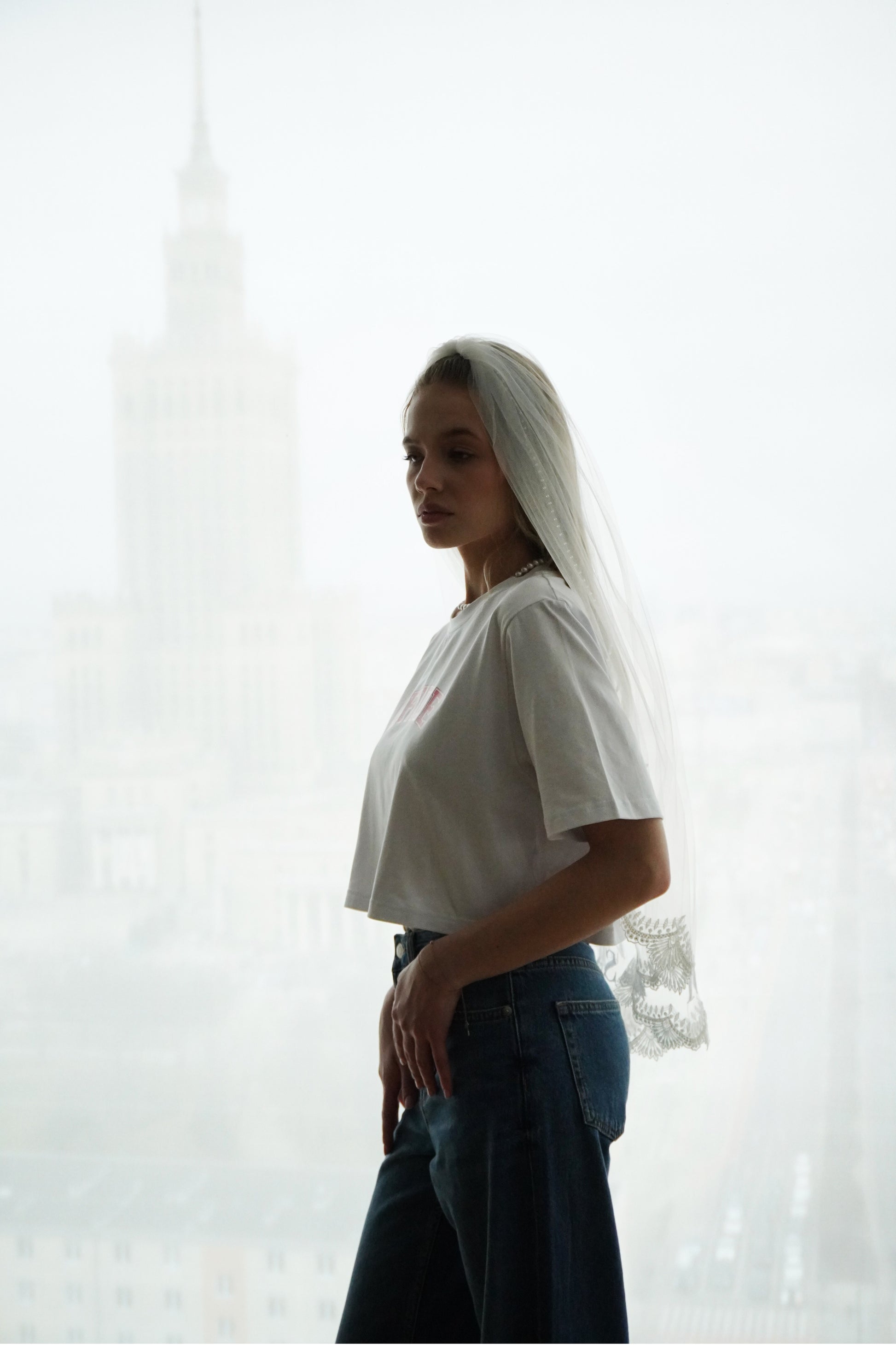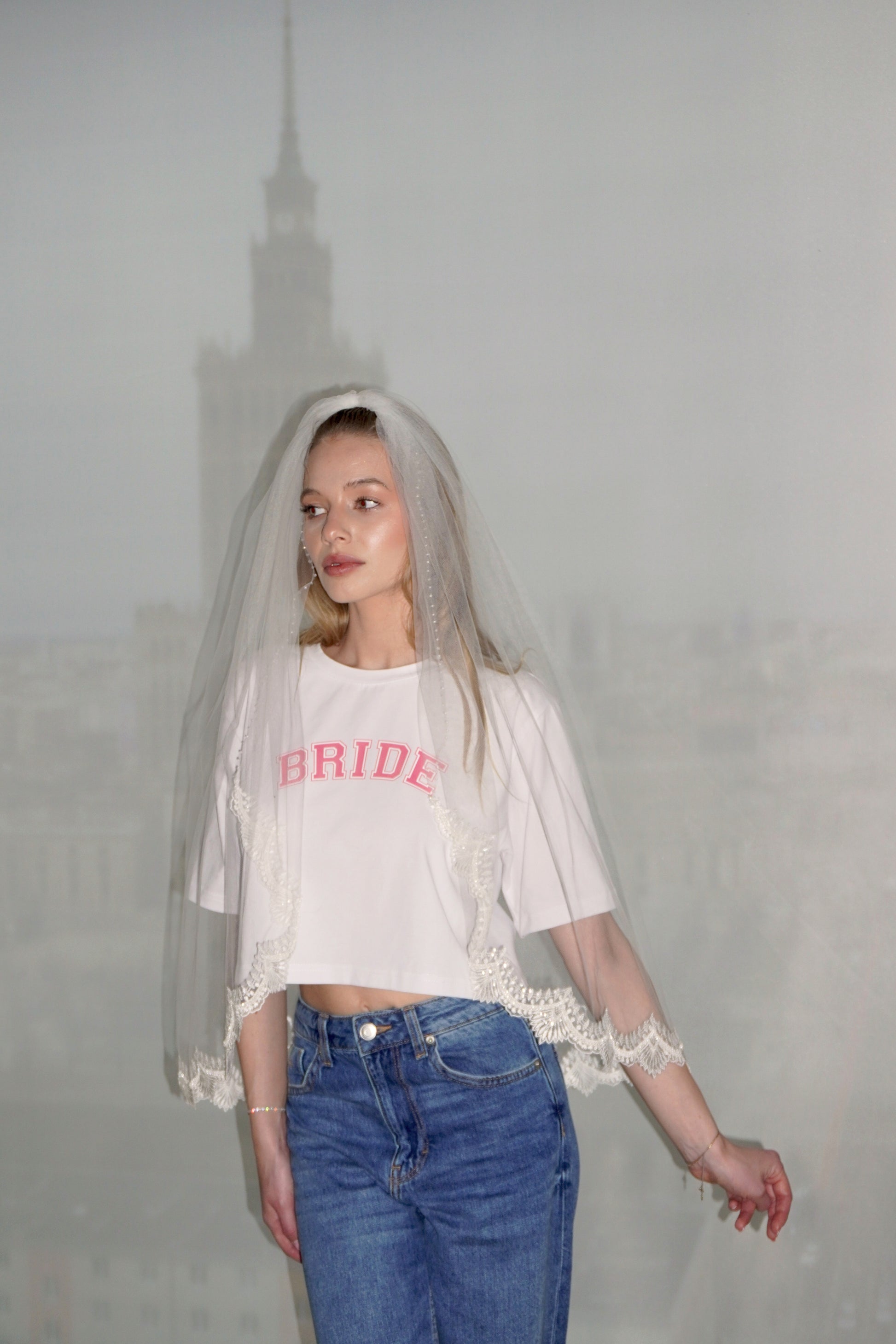 Krótki welon z delikatnym haftem ‘It was always you’ i subtelnymi koralikami. Umieszczony na praktycznym grzebyku, łatwy do założenia i idealny na ślub lub sesję zdjęciową