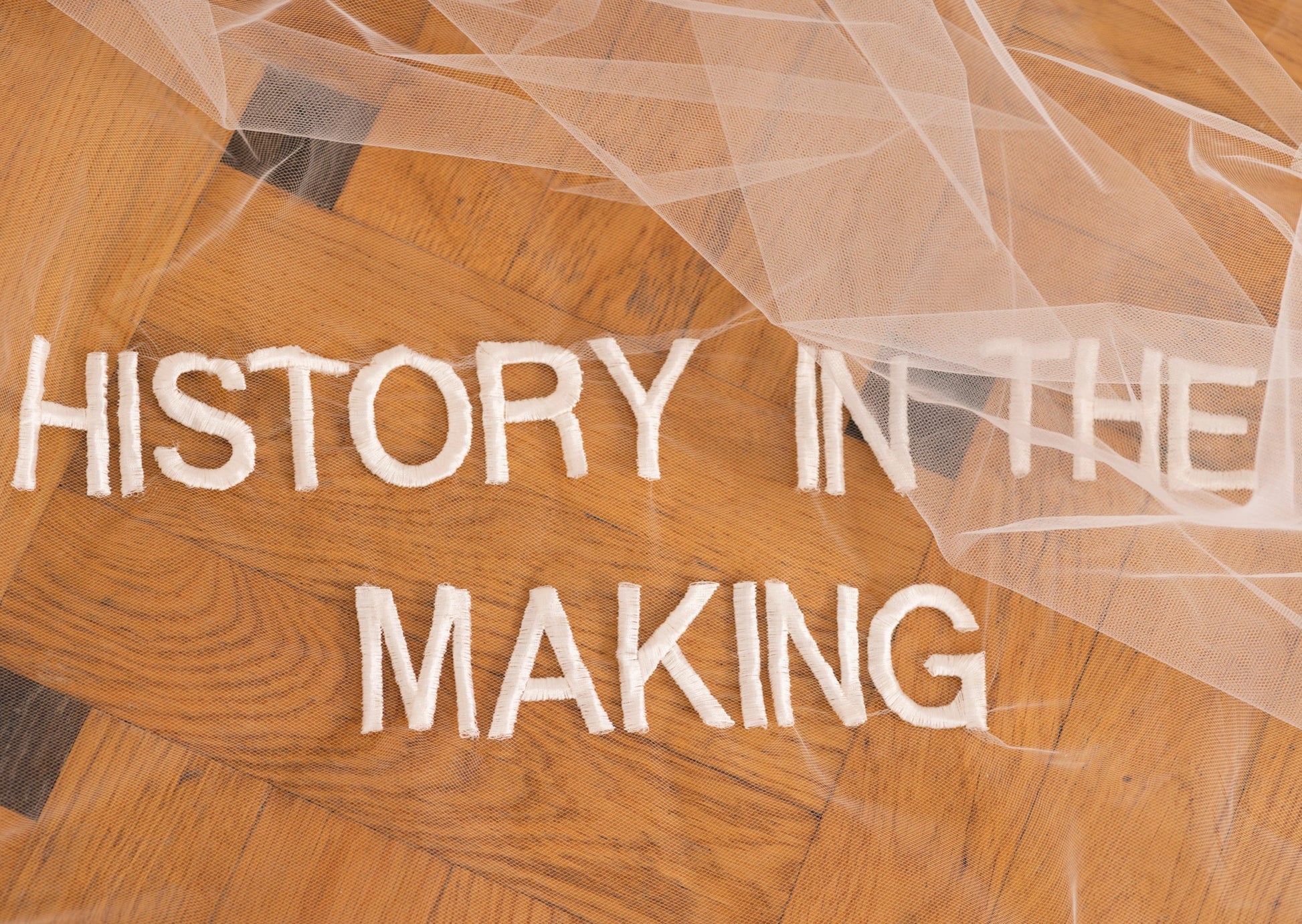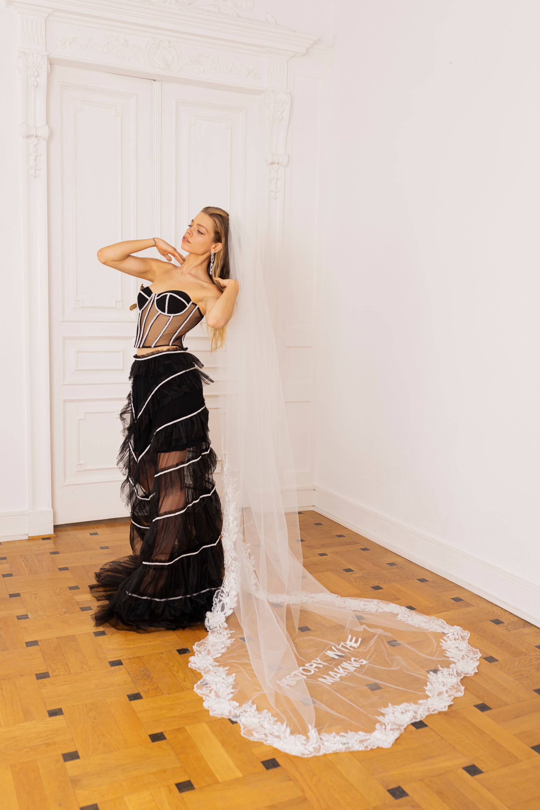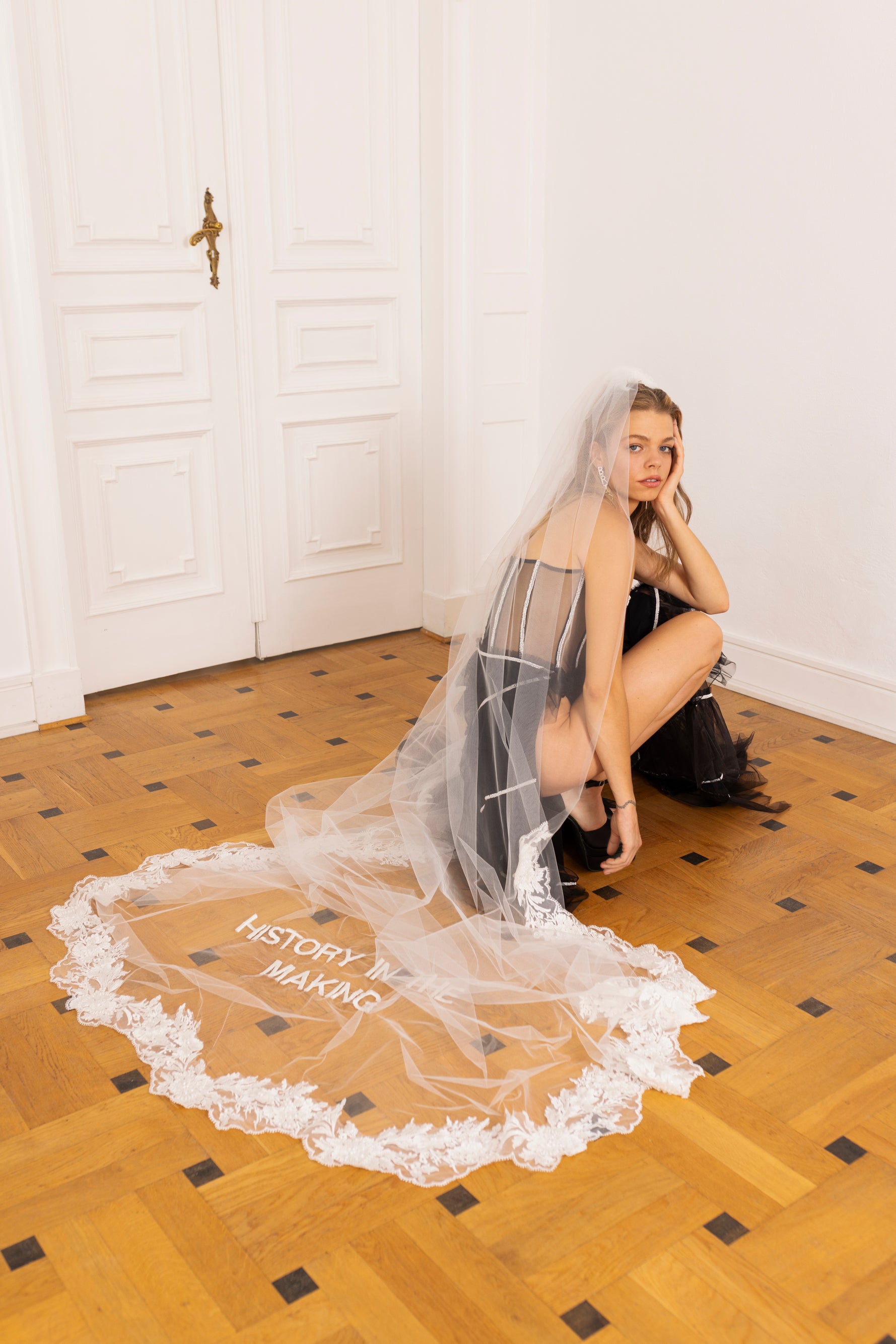 Welon jedno warstwowy o długości 2,5 m w kolorze białym, z koronką i wykończeniem z perełek i dżetów, haftowanym napisem HISTORY IN THE MAKING, welon na grzebieniu.