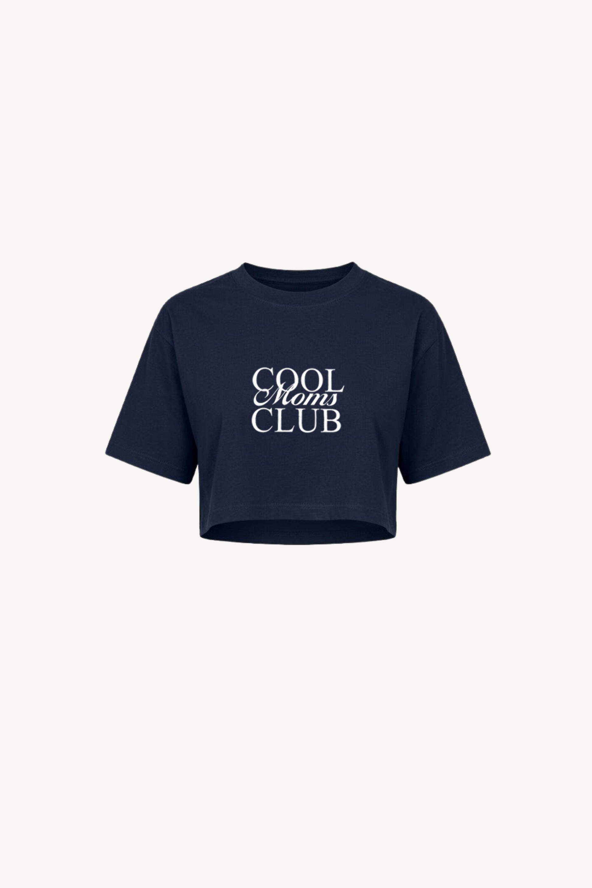 T-shirt crop top COOL MOMS CLUB w kolorze granatowym. Skład materiału: 70% bawełna, 30% bawełna z recyklingu. Gramatura: 200 g, więc koszulka nie prześwituje.