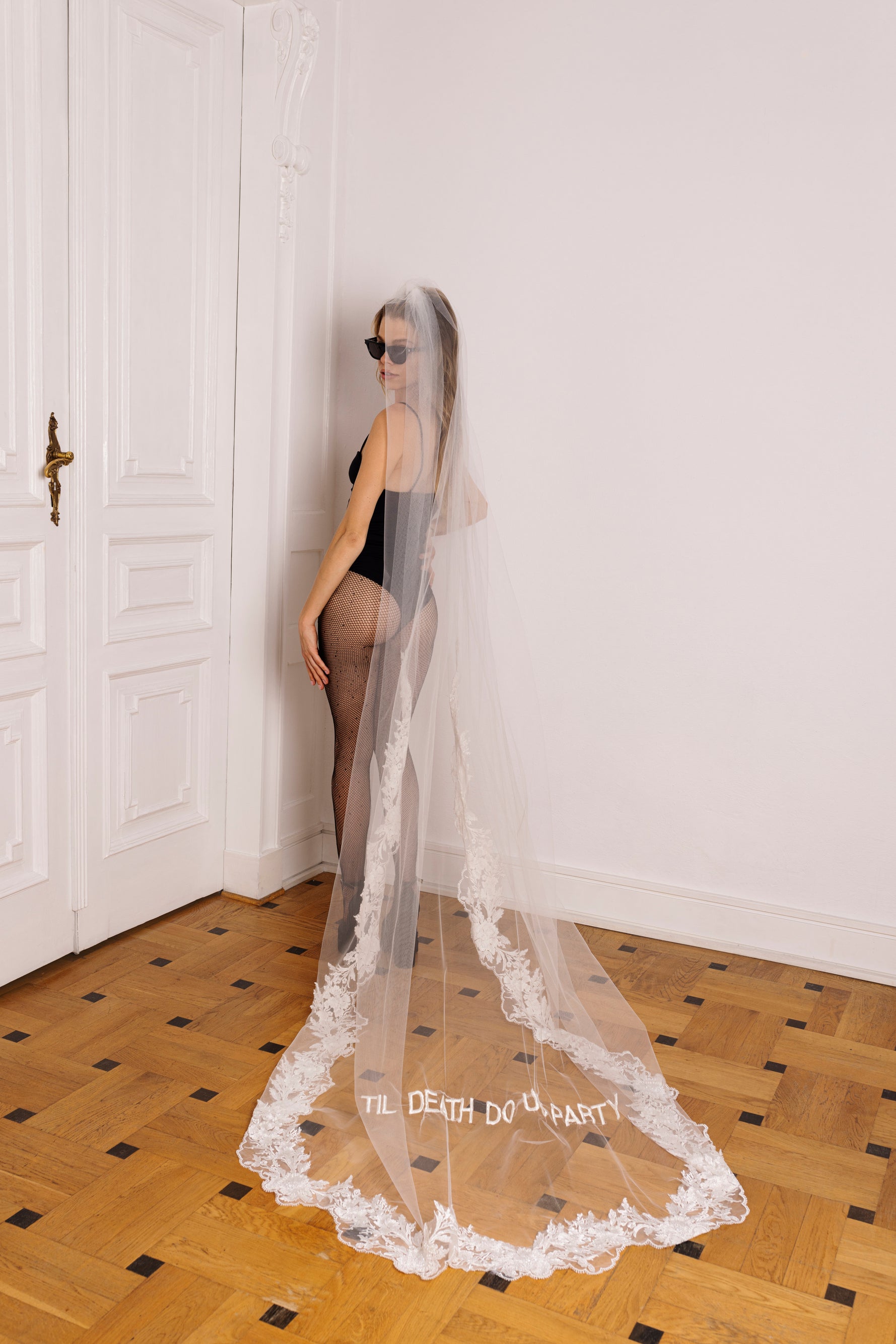 Welon jedno warstwowy o długości 2,5 m w kolorze białym, z koronką i wykończeniem z perełek i dżetów, haftowanym napisem "TIL THE DEATH DO US PARTY", welon na grzebieniu.